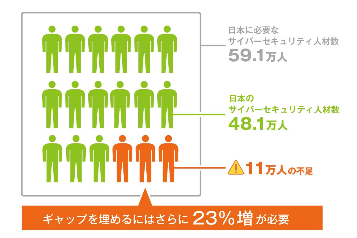 2023年の調査*によると、日本のセキュリティ人材は約48万1,000人に達しましたが、前年比 23.8% 増。需要は59万1,000人に上り、約11万人が不足しています。